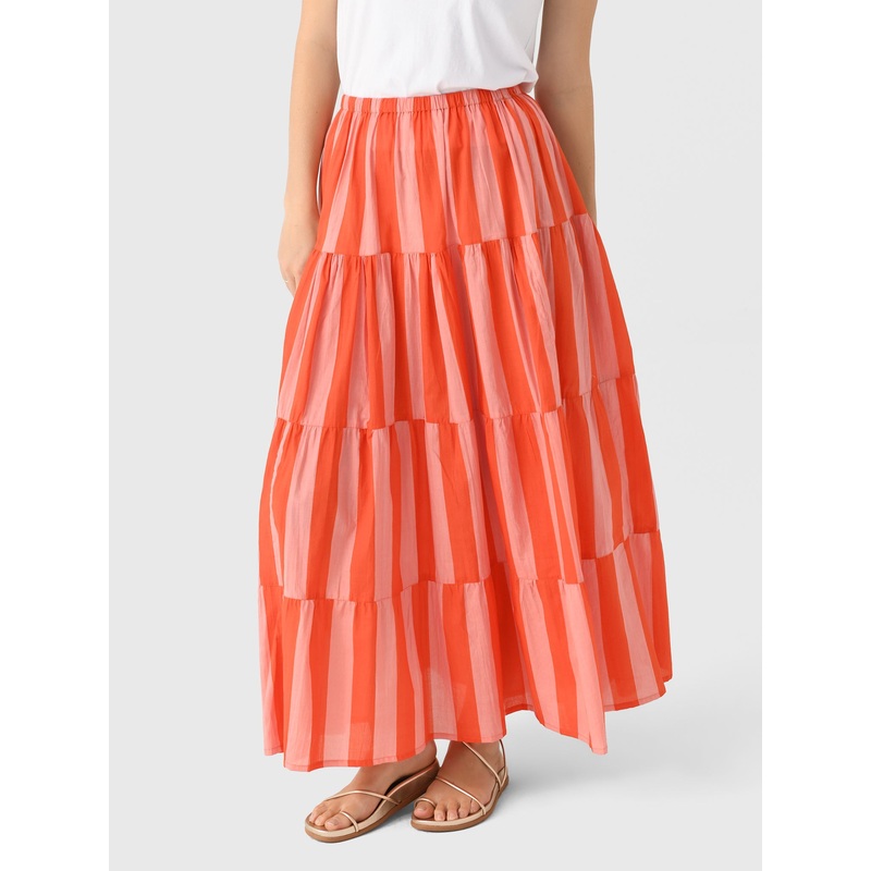 DESCRIPTION:A vibrant cotton maxi skirt featuring a tiered design for a flowing silhouette. It offers comfortable and stylish movement for warm-weather wear.FEATURES:Elastic WaistbandTiered SeamsMaxi SilhouetteAll-Over Stripe Print100% CottonClassic FitMod