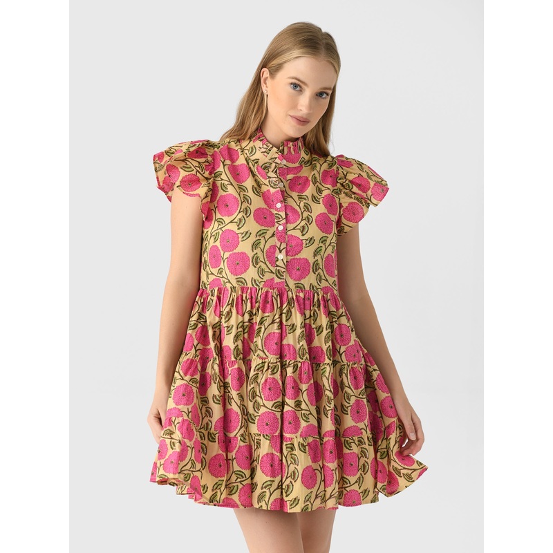 DESCRIPTION:This airy mini dress is made from lightweight cotton and features a custom print and flutter sleeves.FEATURES:Ruffle NecklineRuffle SleevesPartial Button PlacketTiered SkirtMini SilhouetteAll-Over Novelty Print100% CottonClassic FitModel is wea