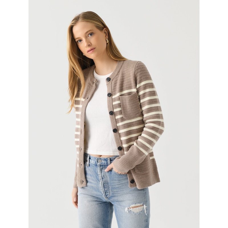 A striped, chunky knit cardigan with patch pockets and a button closure.