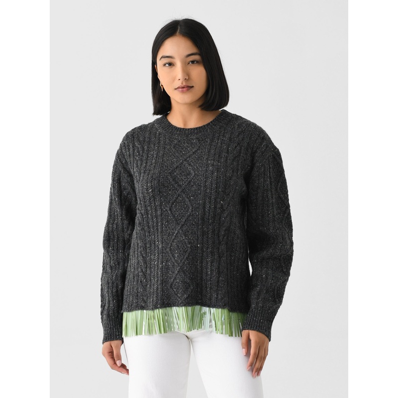 DESCRIPTION:A fisherman-inspired cable knit sweater featuring a contrast hand-applied sequin fringe hem.FEATURES:Crew Neckline3/4 Length SleevesSequin Fringe HemCable Knit Fabrication65% Merino Wool, 30% Recycled Nylon, 5% AlpacaClassic FitModel is wearing