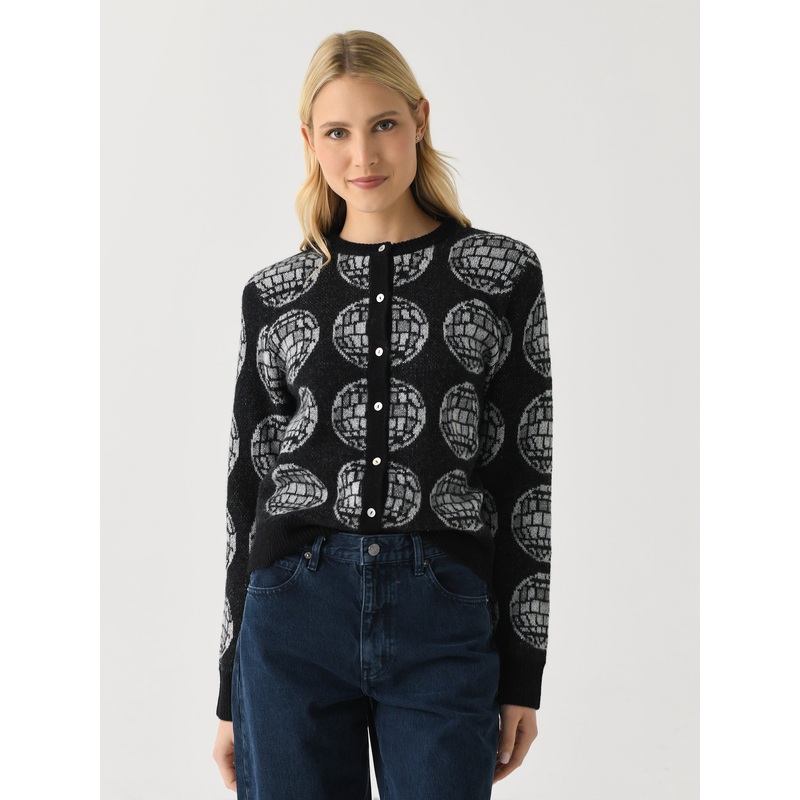 A button-down cardigan made from wool and shimmery lurex featuring disco ball graphics and mother-of-pearl buttons.