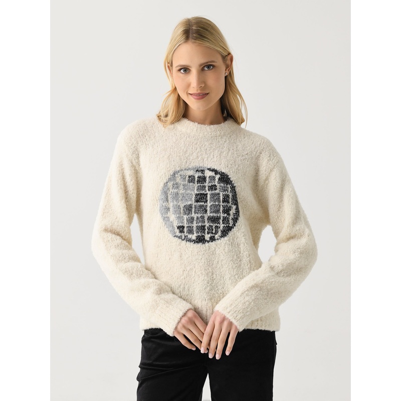 A hand-knit crewneck sweater made from a fuzzy alpaca blend and finished with a disco ball graphic and shimmery lurex yarns.