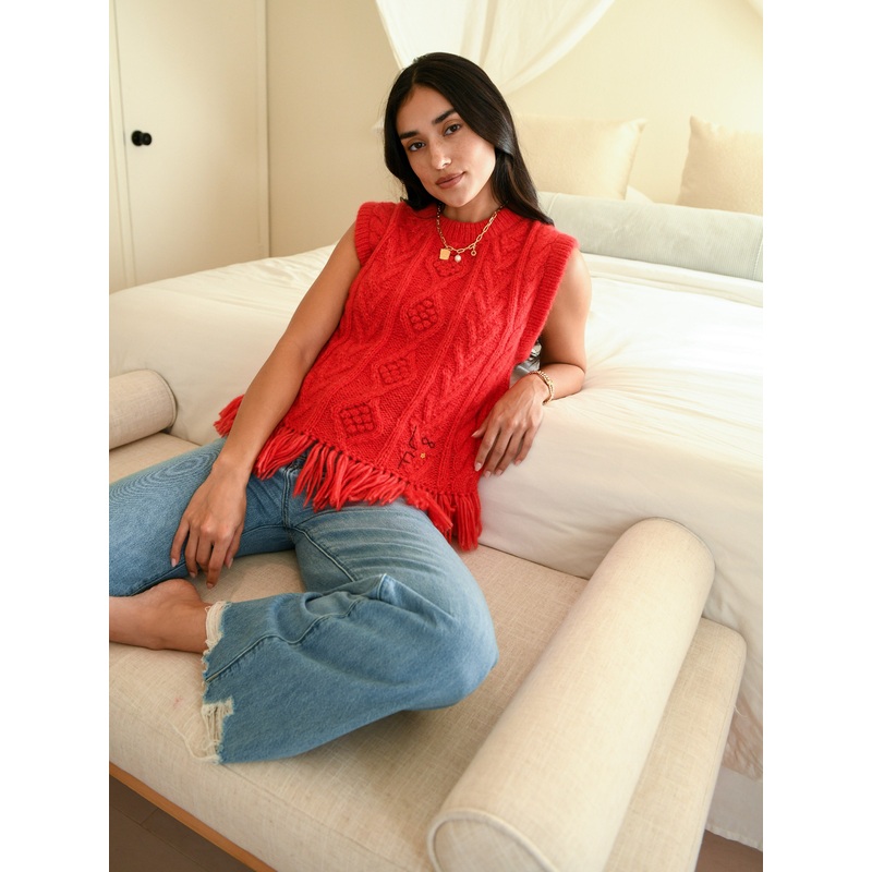 A chunky cable knit vest made from a soft alpaca blend with a whimsical fringe trim.