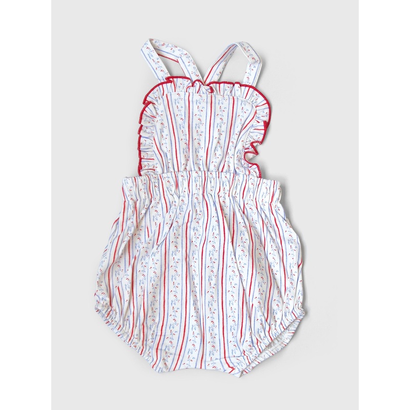 DESCRIPTION:An apron-style bubble made from soft cotton with criss-cross straps and a custom red, white, and blue vine print.FEATURES:High NecklineCriss-Cross StrapsRuffle TrimElastic WaistElastic Leg CuffsAll-Over Novelty Print100% CottonClassic Fit