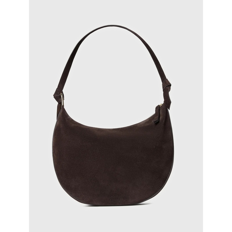 This slouchy shoulder bag is crafted from soft brown suede and finished with elegant gold-tone hardware. It features a secure zipper closure and a convenient interior zip pocket.
