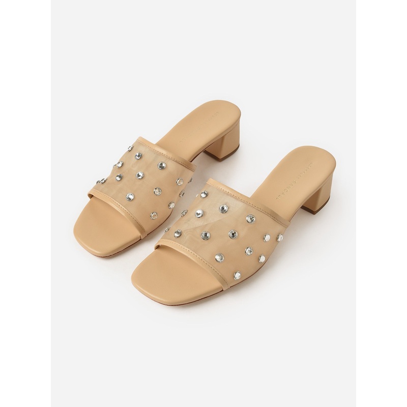 DESCRIPTION:A leather mule sandal with a crystal-embellished mesh strap and low heel.