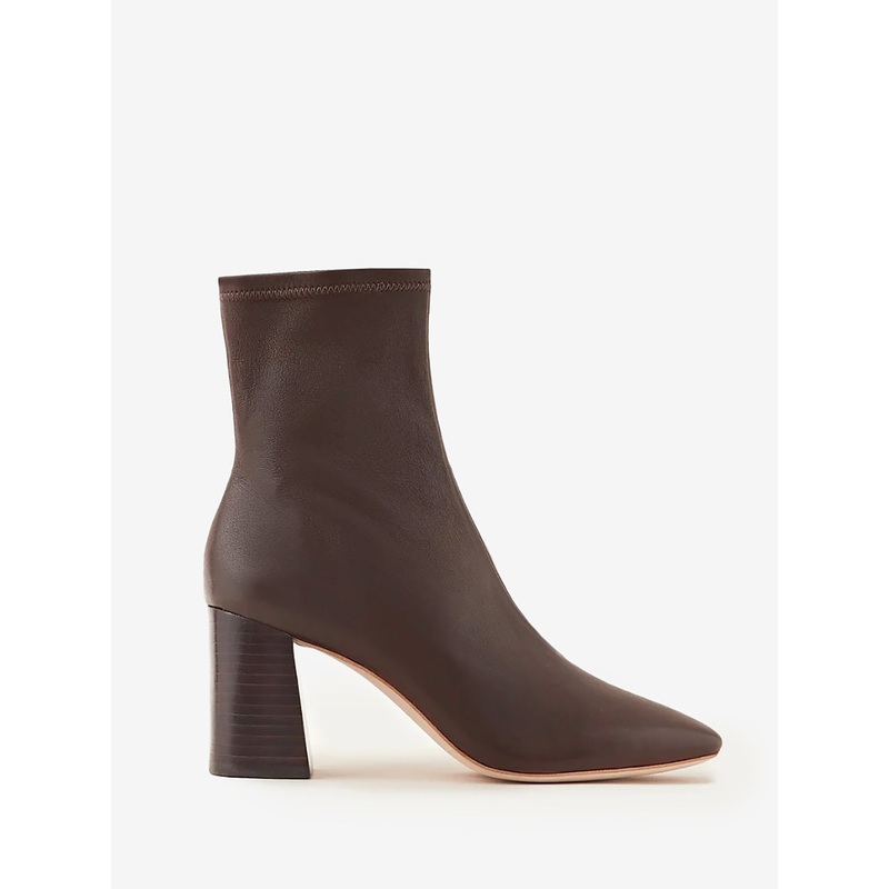DESCRIPTION:Chocolate brown leather bootie with a slim silhouette.