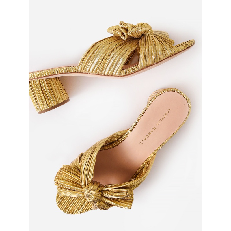 DESCRIPTION:Heeled sandal with a pleated bow detail.