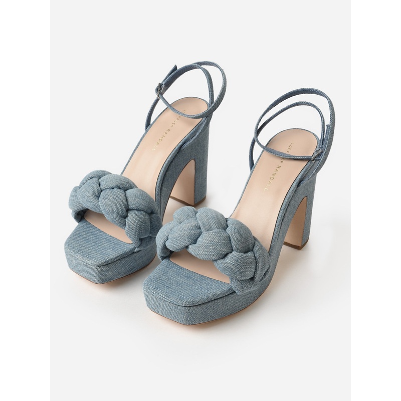 A tweed denim platform sandal with a puffy braided strap and extra high heel.