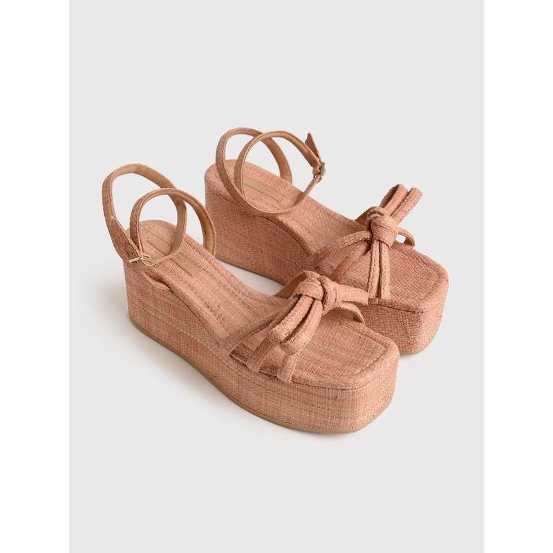 This flatform sandal is made from pink raffia and features a knotted bow detail and an adjustable ankle strap.