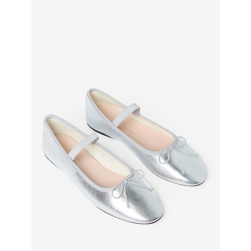 DESCRIPTION:A metallic silver ballet flat made from soft leather with an elastic bridge strap and bow detail.FEATURES:Almond ToeBow DetailElastic StrapPadded Footbed100% Leather