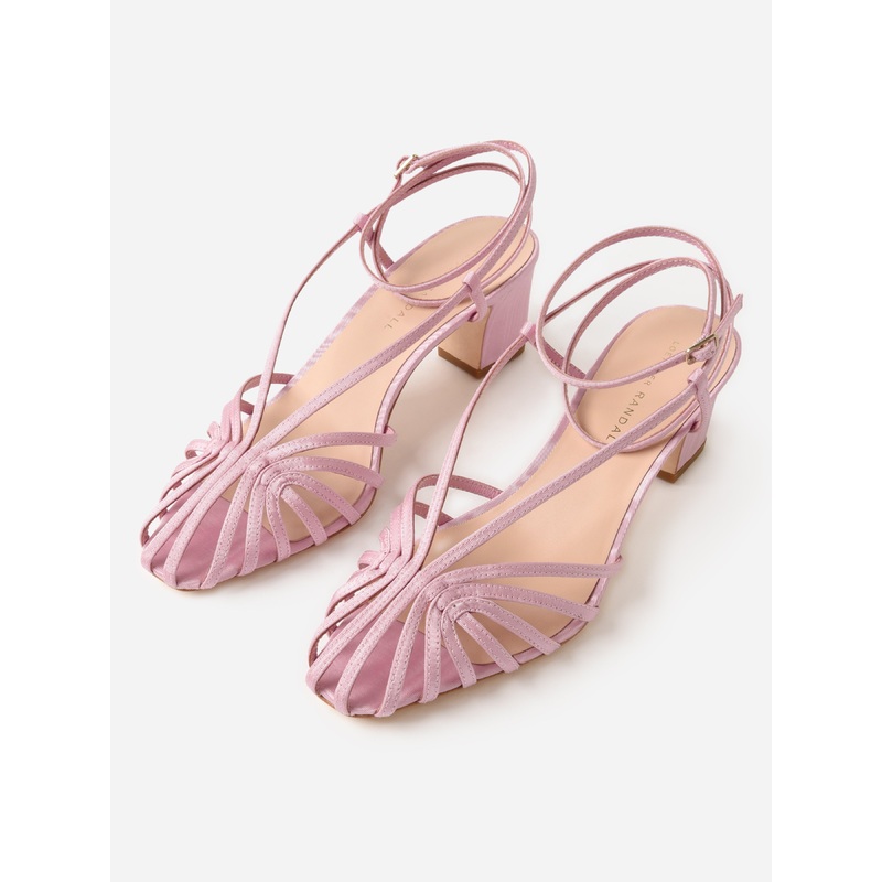 A heeled sandal made from Italian moir fabric with a lattice strap design and an adjustable ankle strap.