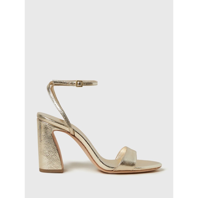 DESCRIPTION:A curved-heel sandal made from champagne-colored crinkle metallic Italian leather.FEATURES:Open ToeAdjustable Ankle StrapCurved Heel100% LeatherHeel Height: 3.5 in.