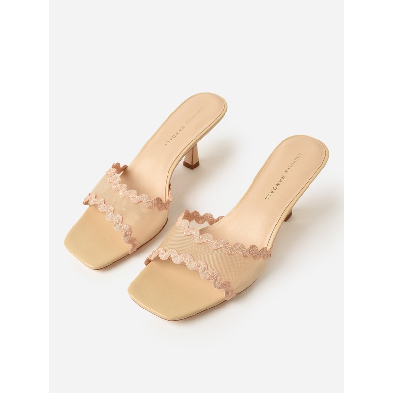 DESCRIPTION:A mid-heel mule with a padded footbed and mesh strap with tonal ric-rac trim.