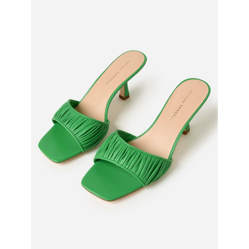 DESCRIPTION:A mid-heel mule made from kelly green Italian Nappa leather with a gathered strap detail and padded footbed.