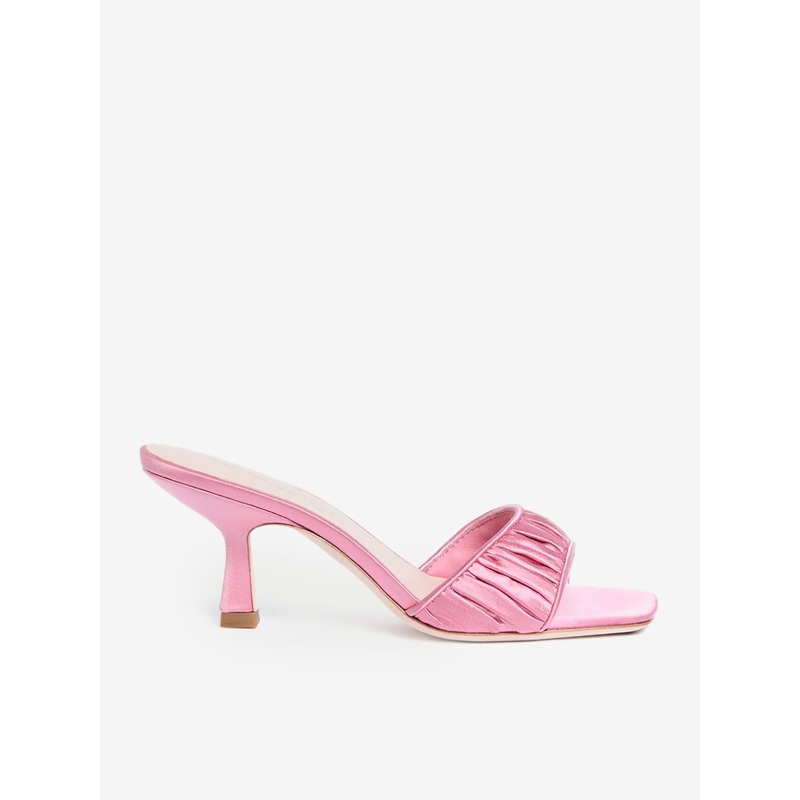 DESCRIPTION:A stylish, mid-heel mule made from pink satin with a gathered strap design.