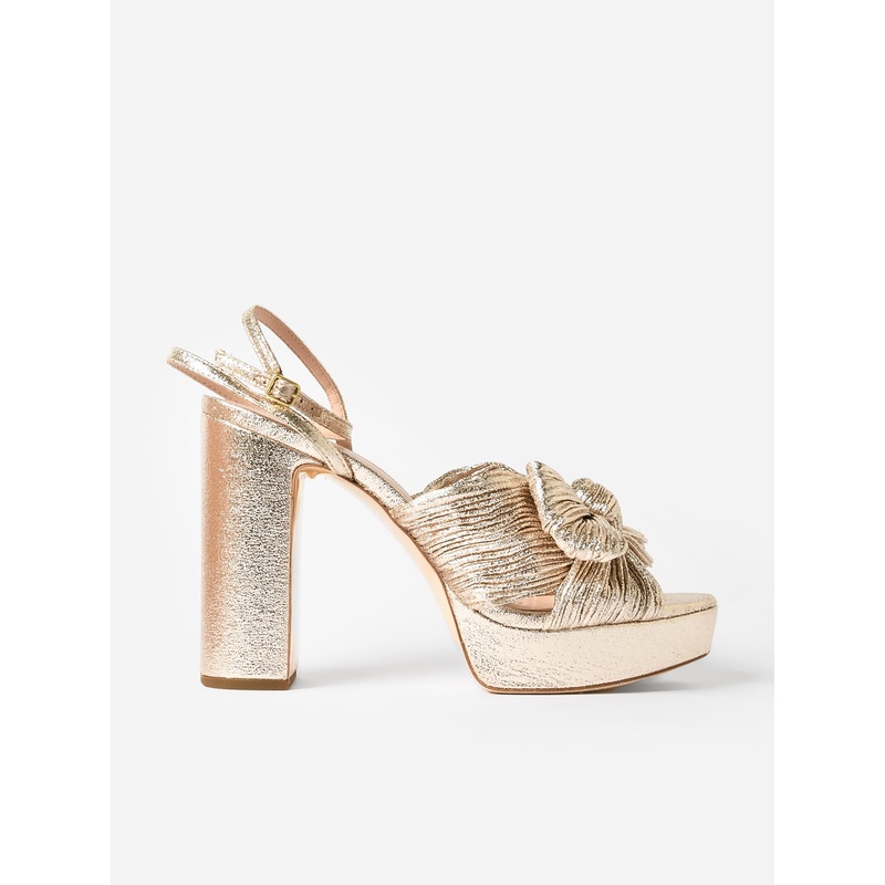 Pleated lam platform sandal with a signature knotted bow and adjustable ankle strap.