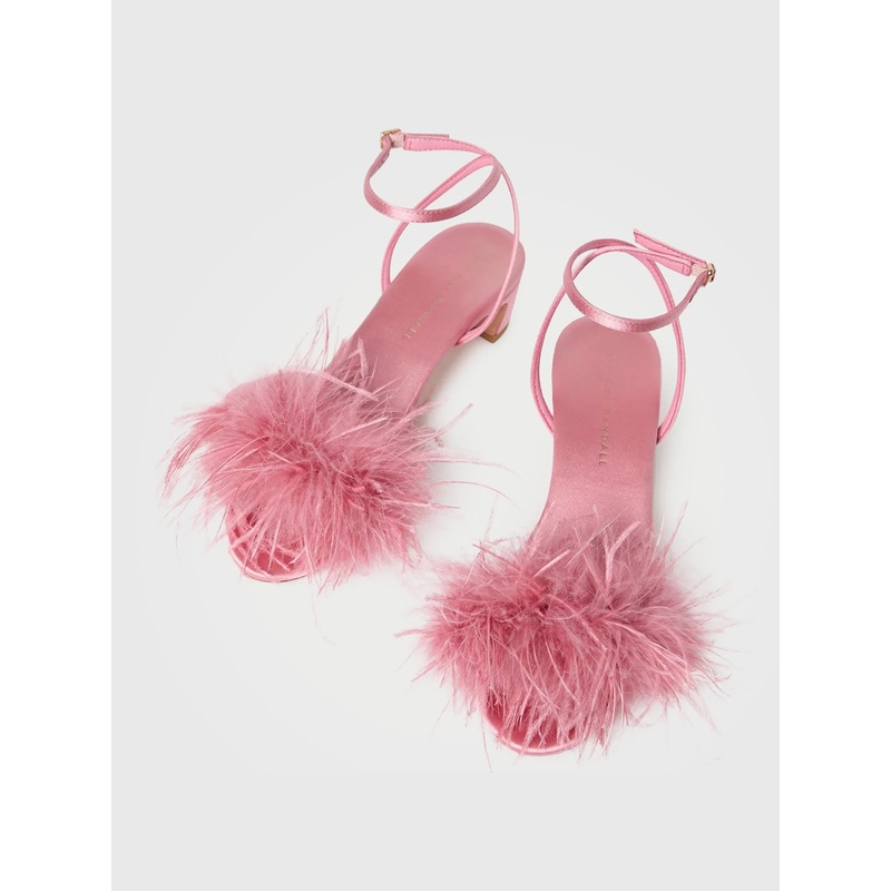 A mid-heeled sandal made from rose-colored Italian satin and finished with a playful feather detail and a padded footbed.