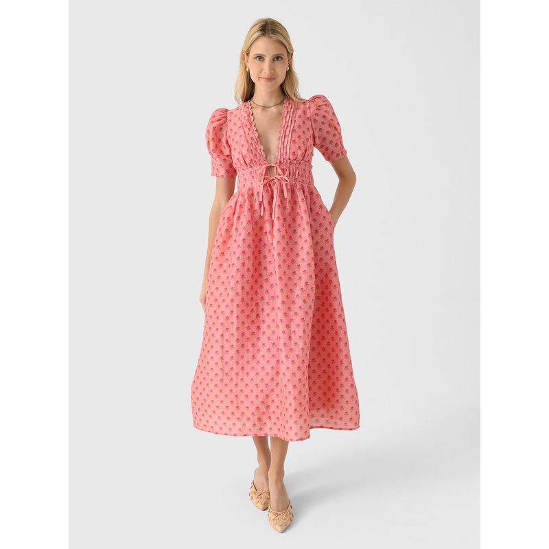 DESCRIPTION:Crafted from luxurious silk linen in a delicate tiny rose print, the Boehm Dress features intricate pin-tucked pleating, blousy puff sleeves with fitted pin-tucked cuffs, and a charming double ribbon front detail.FEATURES:Deep V-NecklinePuff Sl