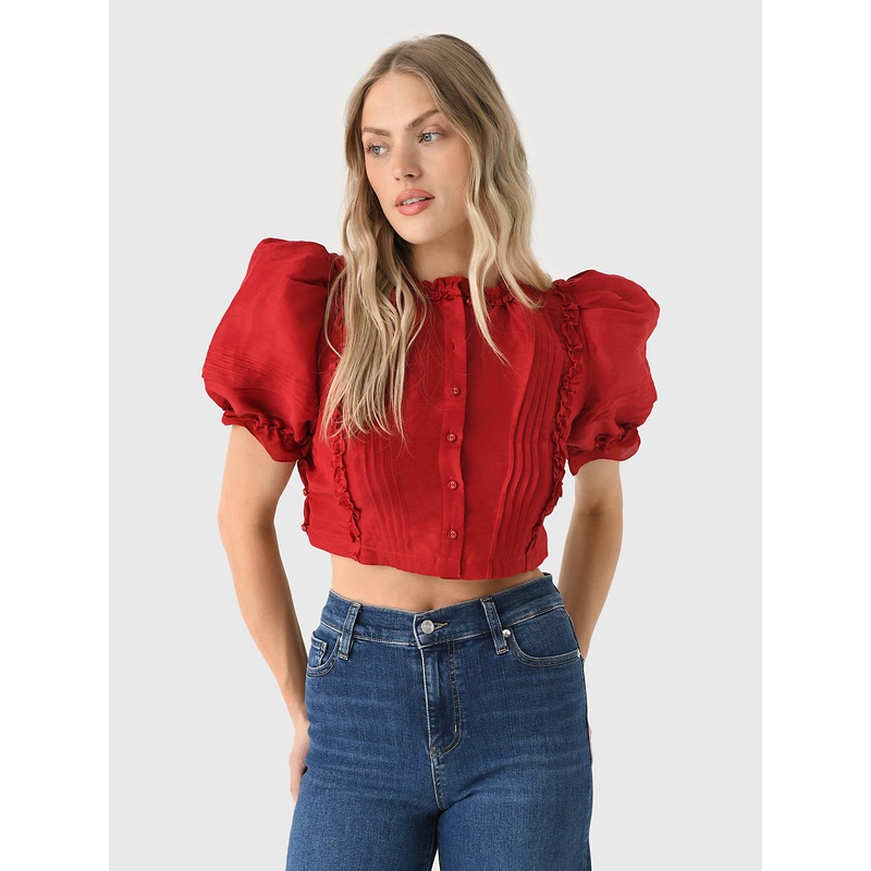 DESCRIPTION:This chic and feminine blouse is crafted from a luxurious linen-silk blend. The slightly cropped design is complemented by elegant pintucks and delicate ruffle trim. Puff sleeves complete the look, making it a stylish and sophisticated choice f