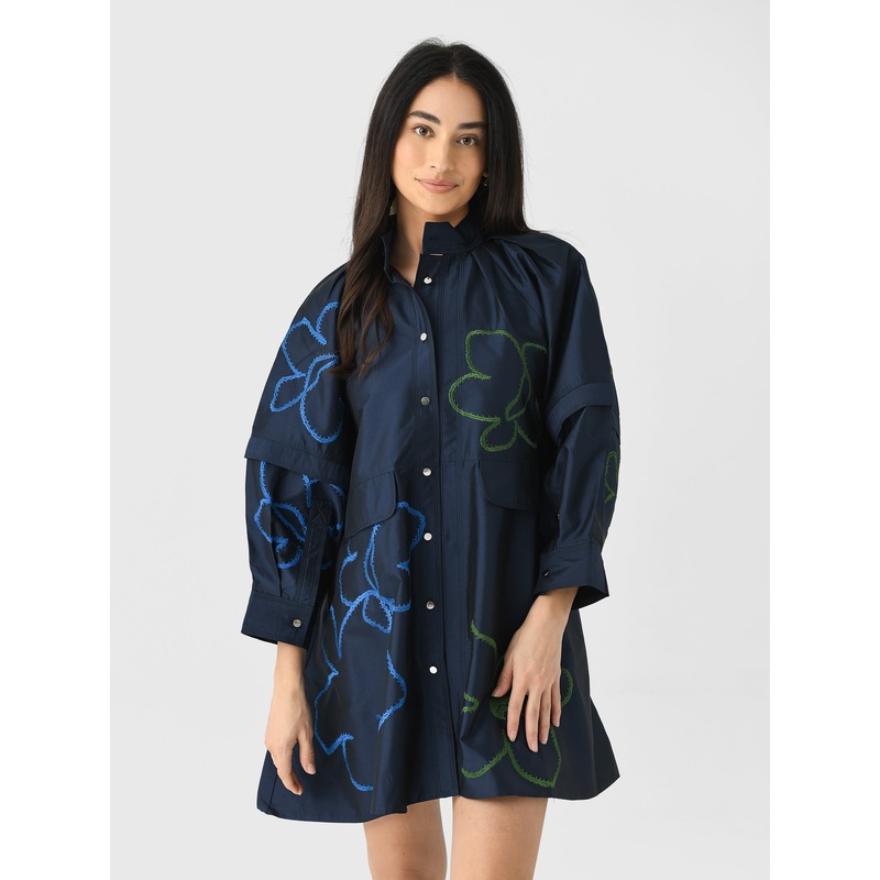 This dress features a high collar and a unique, layered silhouette with voluminous sleeves. It’s adorned with bold, embroidered floral designs, adding a vibrant contrast to the dark fabric. The dress is cinched at the neck with a stylish, gathered detail.