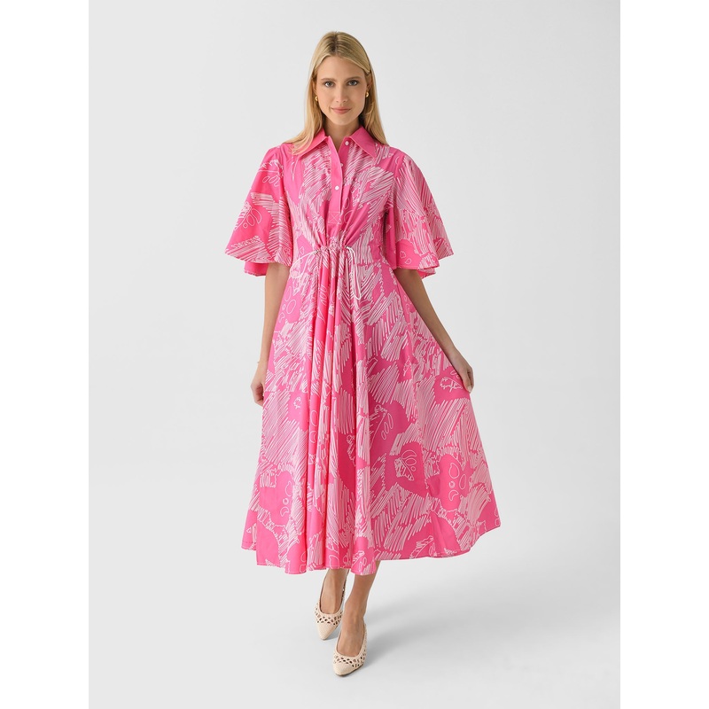 DESCRIPTION:A vibrant pink maxi dress featuring gathered sleeves, an adjustable drawcord waist, and a full skirt.FEATURES:Spread CollarPartial Button PlacketGathered SleevesDrawcord WaistGathered SkirtMaxi SilhouetteAll-Over Novelty Print100% CottonClassic
