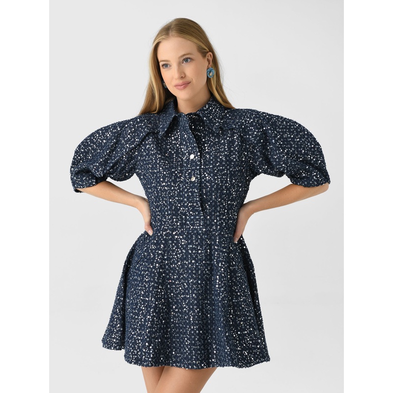 This stunning mini dress is crafted from a unique shimmer denim fabric that catches the light with its subtle sparkle. The dress features a classic collar and a button-down front, while its silhouette is structured and playful with a fitted waist and a flared skirt. The voluminous sleeves add a dramatic touch, making it a statement piece for any occasion.