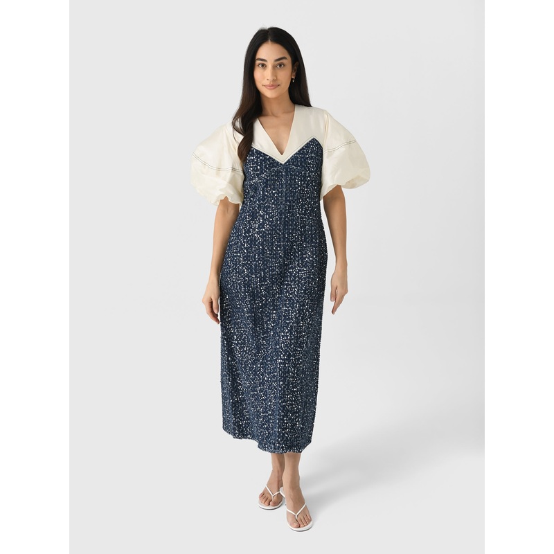 This elegant dress combines two stylish textures for a unique look. The body of the dress is made from shimmer denim with a subtle sparkle. It features a fitted silhouette, a V-neckline, and a slight A-line flare at the hem. The dress is accented with contrasting white puffed sleeves, adding a touch of romance and volume.