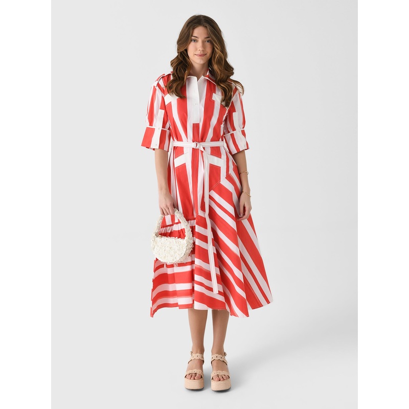 DESCRIPTION:This vibrant striped dress features half-length sleeves, an adjustable D-ring belt, and a flowy asymmetrical tiered skirt.FEATURES:Spread CollarHalf-Length SleevesPartial Button PlacketAdjustable BeltAsymmetrical Ruffle SkirtMaxi SilhouetteAll-
