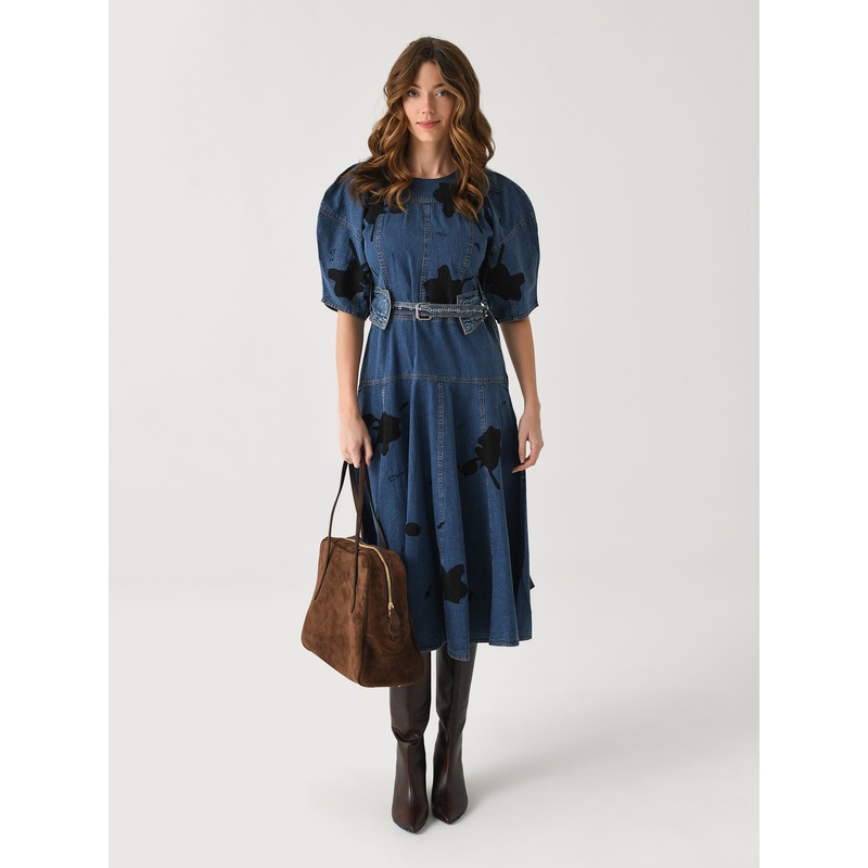 A mid-length denim dress with a contrast abstract print, puff sleeves, and an adjustable belt.