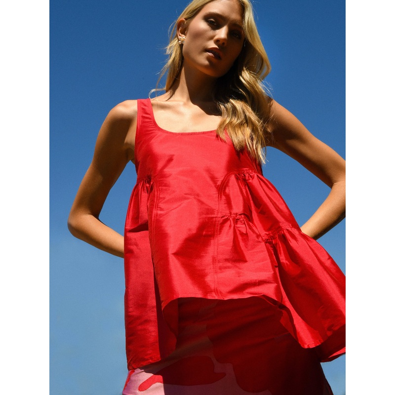 DESCRIPTION:A sleeveless blouse made from lightweight fabric with gathered details, tiered seams, and a full silhouette.FEATURES:Scoop NecklineFixed StrapsGathered PanelsTiered SeamsLightweight FabricationRelaxed FitModel is wearing size Small top.Model's