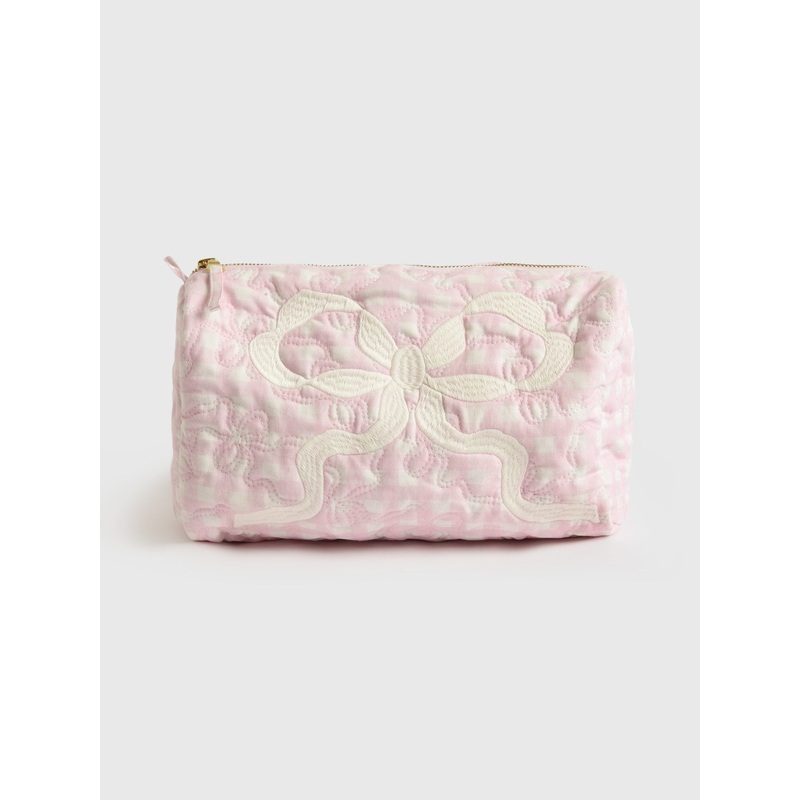 A charming pouch made from soft cotton fabric with a gingham print and an embroidered bow motif.