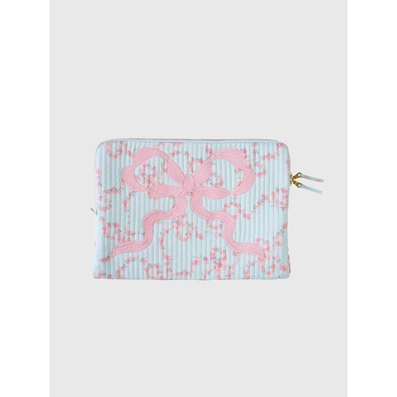 A charming laptop case featuring a quilted texture with a subtle floral print. It’s elegantly accented by a large, embroidered bow, offering stylish protection for your device.