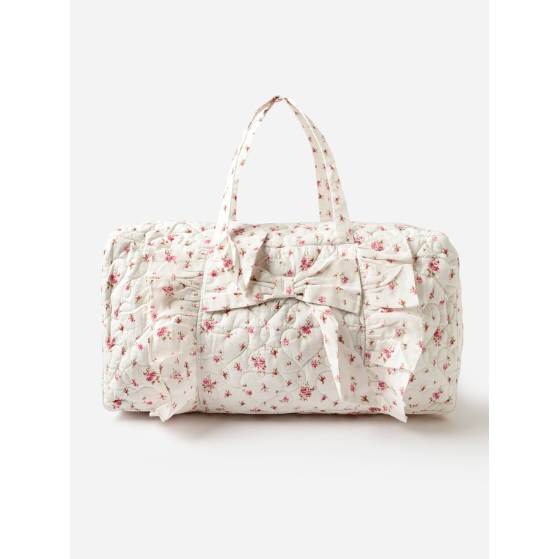 DESCRIPTION:A soft quilted duffle bag featuring a dainty floral print.FEATURES:Double HandlesZip ClosureBow Detail, Ruffle TrimsQuilted ExteriorDimensions: 18 in. W x 10 in. H x 7.5 in. D