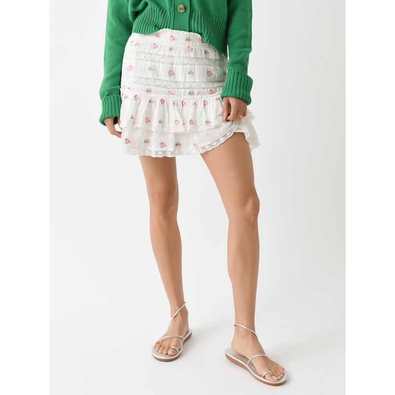 DESCRIPTION:A lightweight mini skirt with flowing layers and dainty lace trim.FEATURES:Smocked WaistbandTiered HemLace TrimMini LengthA-Line SilhouetteAll-Over Floral Print100% CottonSlim FitModel is wearing size Small skirt.Model's Measurements: Height: 5
