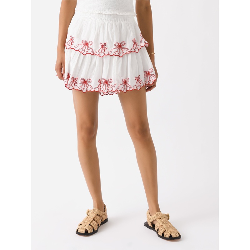 A lightweight cotton mini skirt with layered tiers and an embroidered cherry design.