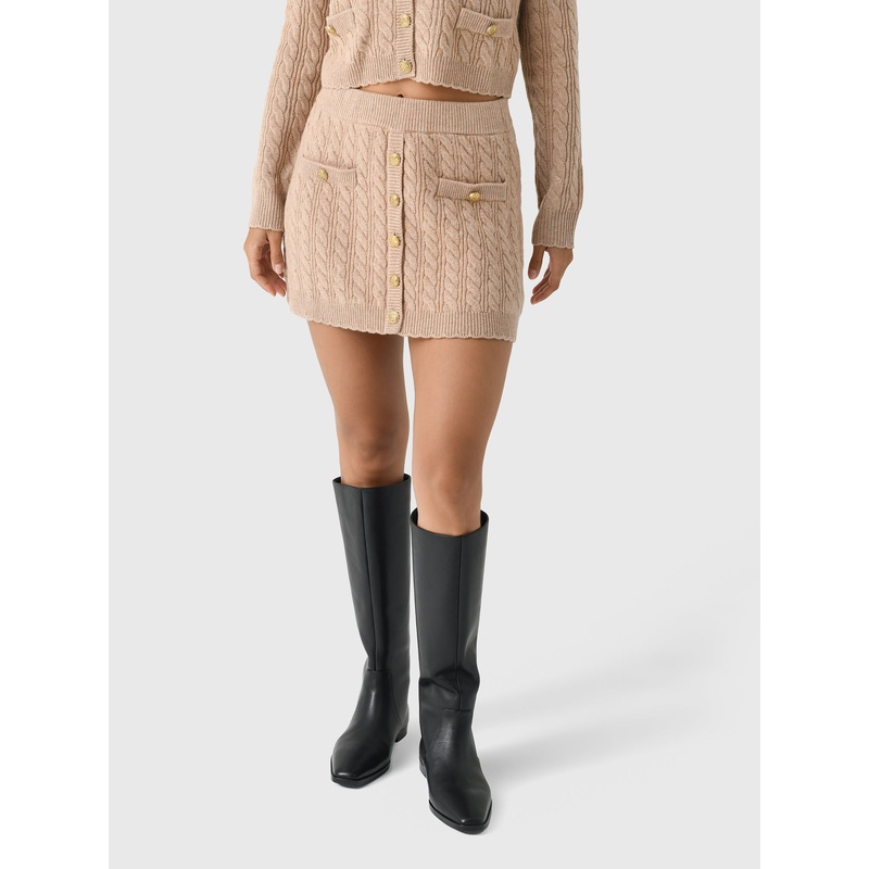 Crafted from a luxurious wool-cashmere blend, this cable knit mini skirt offers a cozy feel and a polished look. Finished with gleaming gold button detailing, it’s an elegant and timeless addition to any wardrobe.