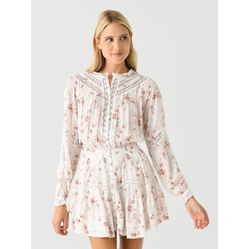 DESCRIPTION:A lightweight dobby cotton mini dress with a sweet floral print and inset lace and pintuck details throughout.FEATURES:Round NecklineLong SleevesButton-Down FrontSmocked WaistTiered HemInset Lace, PintucksMini SilhouetteAll-Over Novelty Print10
