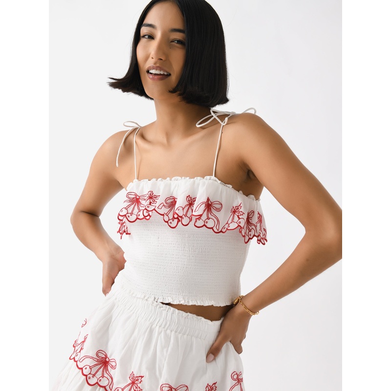 A slightly cropped smocked tank top featuring self-tie straps and a cherry embroidered ruffle-trimmed neckline.