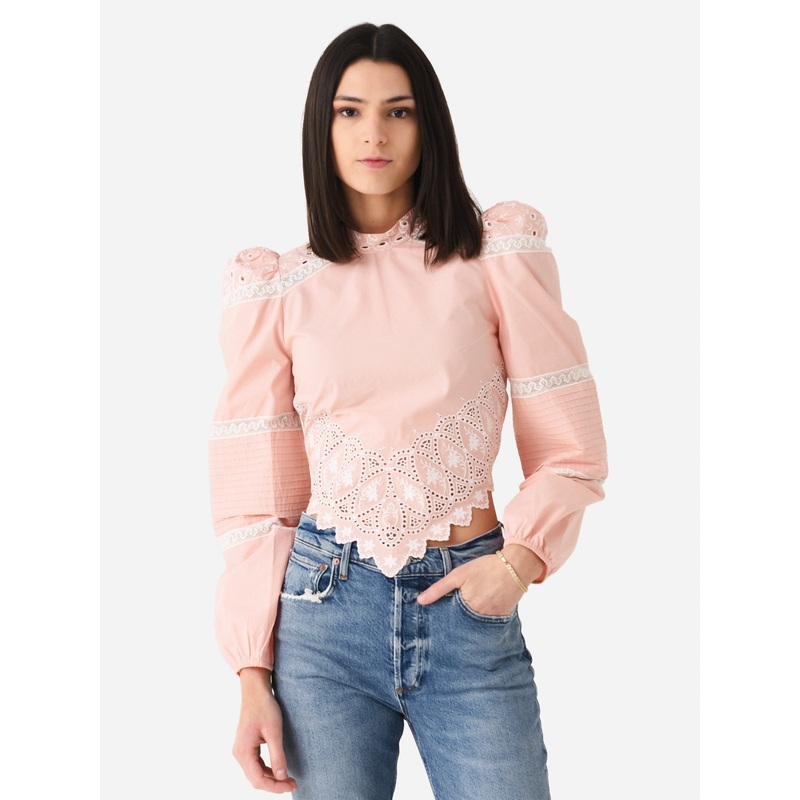 DESCRIPTION:Long-sleeve top with custom floral eyelet trim and lace detailing with a handkerchief hem.FEATURES:TopHigh NecklineLong Sleeve with Elastic CuffsOpen Back with Tie ClosureHandkerchief HemCustom Eyelet Trim & Lace DetailingLength: 23 in.Lightwei
