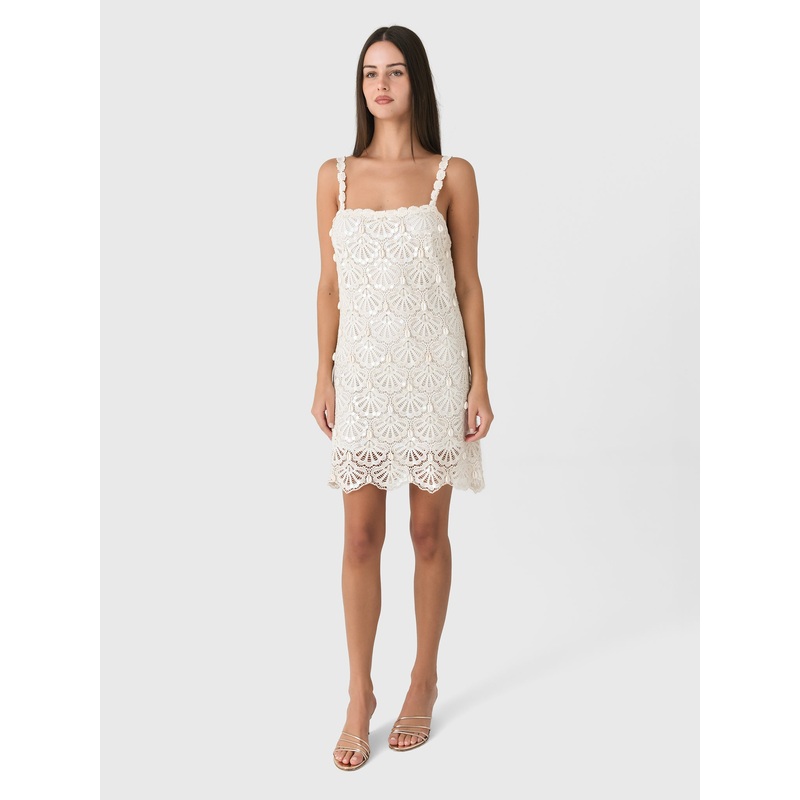 This mini features custom machine crochet, adorned with delicate sequins and seashell beads for all-over shimmer. Its sheath silhouette includes crochet lace at the neckline, intricate embroideries, a scalloped hem, and a functional zipper.