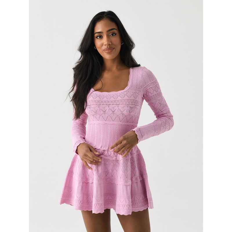 A soft, pointelle knit mini dress featuring a fitted bodice that falls to an airy skirt.
