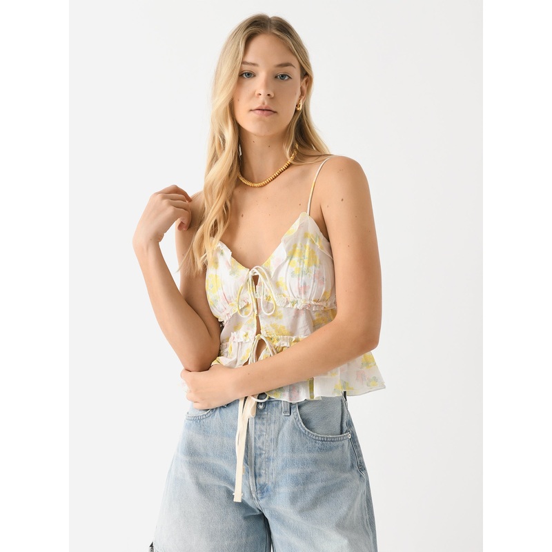 DESCRIPTION:A lightweight cotton top with ruffle trims, self-tie closures, and a pink and yellow floral print.FEATURES:V-NecklineThin, Fixed StrapsFront Self-TiesRuffle TrimsAll-Over Novelty Print100% CottonSlim FitModel is wearing size Small top.Model's M