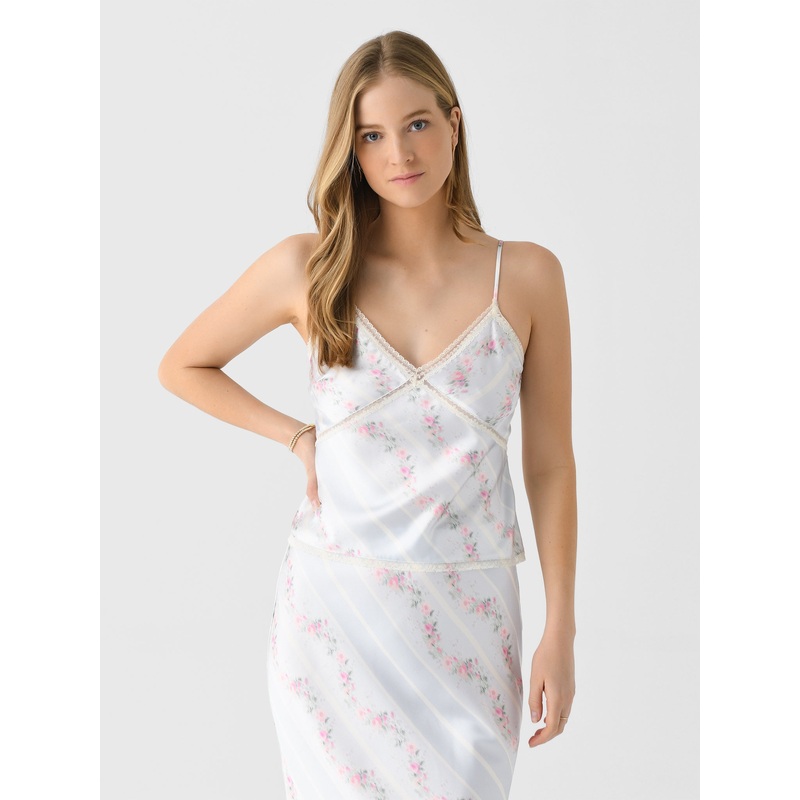 This delicate camisole features a soft floral print, pastel hues, and intricate lace trims for a dreamy design.