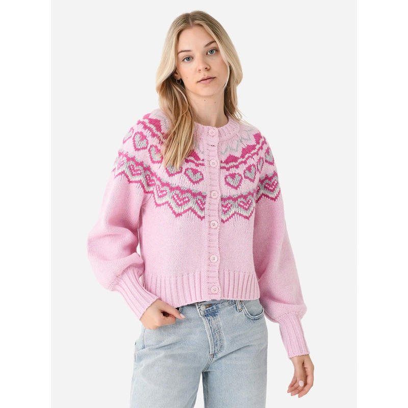 DESCRIPTION:A pretty pink cardigan made from cozy wool featuring a festive Fairisle heart design.FEATURES:Round NecklineRaglan SleevesFairisle Heart PrintButton ClosureRibbed Neckline, Cuffs and HemKnit Fabrication100% WoolClassic FitModel is wearing size
