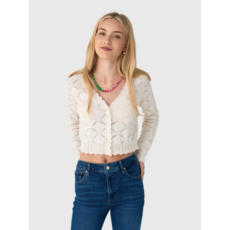 A charming cardigan featuring a delicate pointelle knit and scalloped trims. This cropped, button-front piece offers a sweet and versatile layering option.