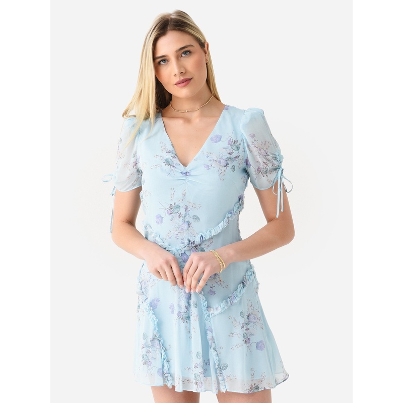 DESCRIPTION:Feminine georgette mini dress with asymmetrical ruffle seams.FEATURES:Mini DressShirred V-NecklineShort Puff Sleeve with TiesSide Zip ClosureAsymmetrical Ruffle SeamsLength: 34 in.All-Over Novelty PrintGeorgette FabricationSelf: 100% Viscose |