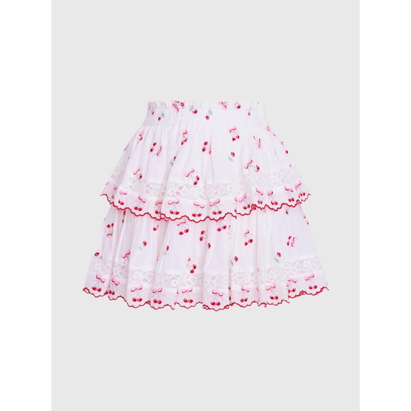 DESCRIPTION:This best-selling skirt is made from lightweight fabric with an embroidered cherry print and inset lace detailing.FEATURES:Elastic WaistbandTiered RufflesInset LaceMini SilhouetteAll-Over Embroidered Print100% CottonSlim Fit