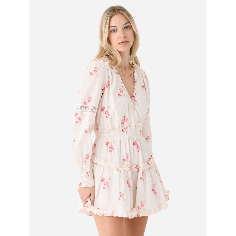 DESCRIPTION:A lightweight cotton dress featuring blouson sleeves, ruffle trims, and a French-inspired ikat floral print.FEATURES:V-NecklineBlouson SleevesCustom Lace InsetsButton CuffsSmocked WaistbandTiered SkirtAll-Over Novelty PrintLength: 33.5 in.100%