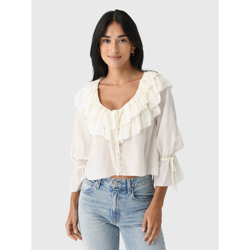This feminine blouse is made from lightweight silk. It features layered ruffle details and an adjustable drawstring neckline and cuffs.